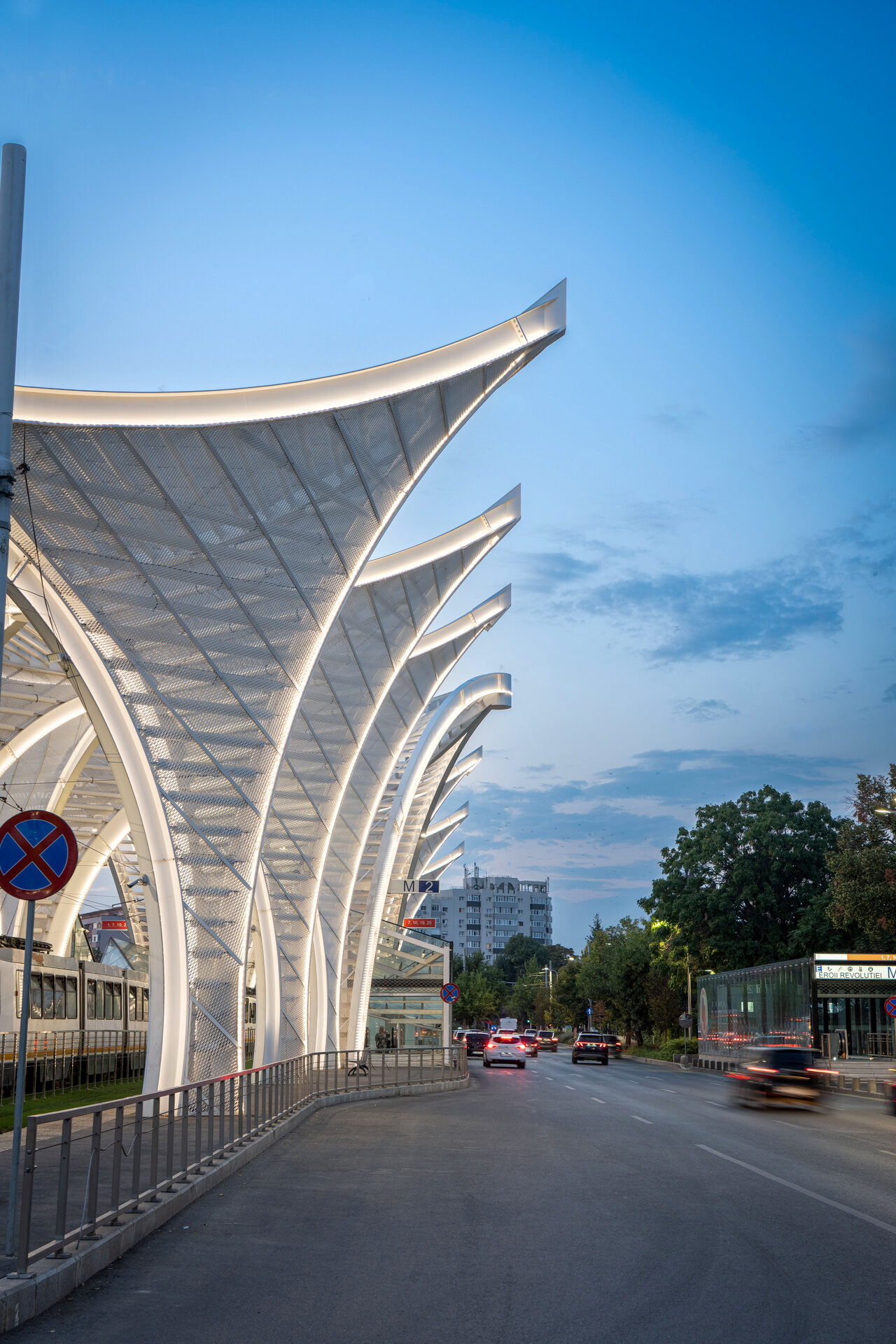 Corpurile de iluminat sunt tratate ca elemente neutre, cu prezență minimă în timpul zilei și expresie controlată pe timp de noapte. Finisajul alb și proporțiile reduse permit integrarea lor în limbajul existent al peronului.